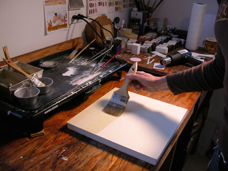 "Encaustic" is a Greek word meaning 'to heat or burn in' (enkaustikos). Heat is used throughout the process, from melting the beeswax and varnish to fusing the layers of wax. Encaustic consists of natural bees wax and dammar resin (crystallized tree sap). The medium can be used alone for its transparency or adhesive qualities or used pigmented. Pigments may be added to the medium, or purchased colored with traditional artist pigments. The medium is melted and applied with a brush or any tool the artist wishes to create from. Each layer is then reheated to fuse it to the previous layer.